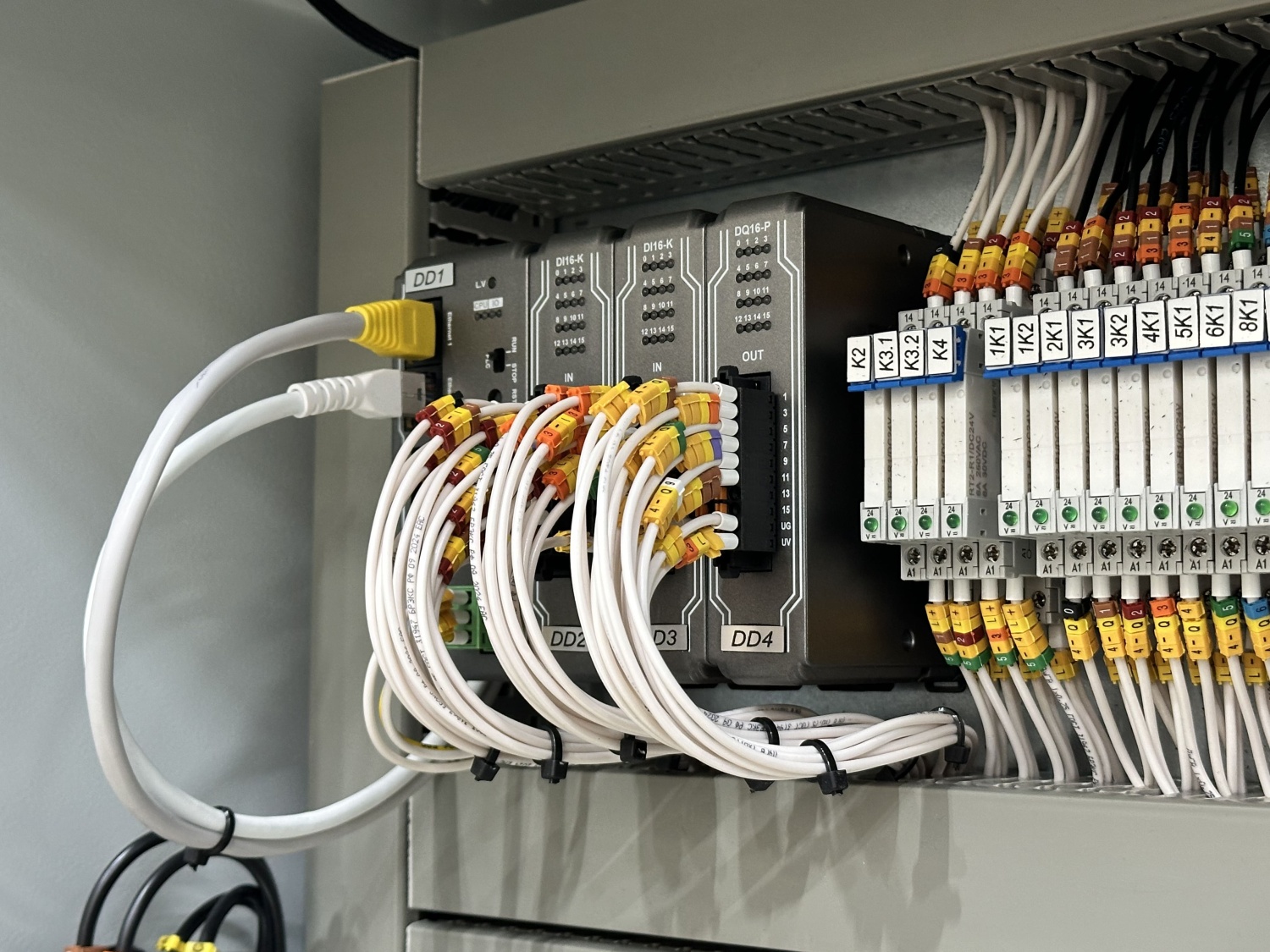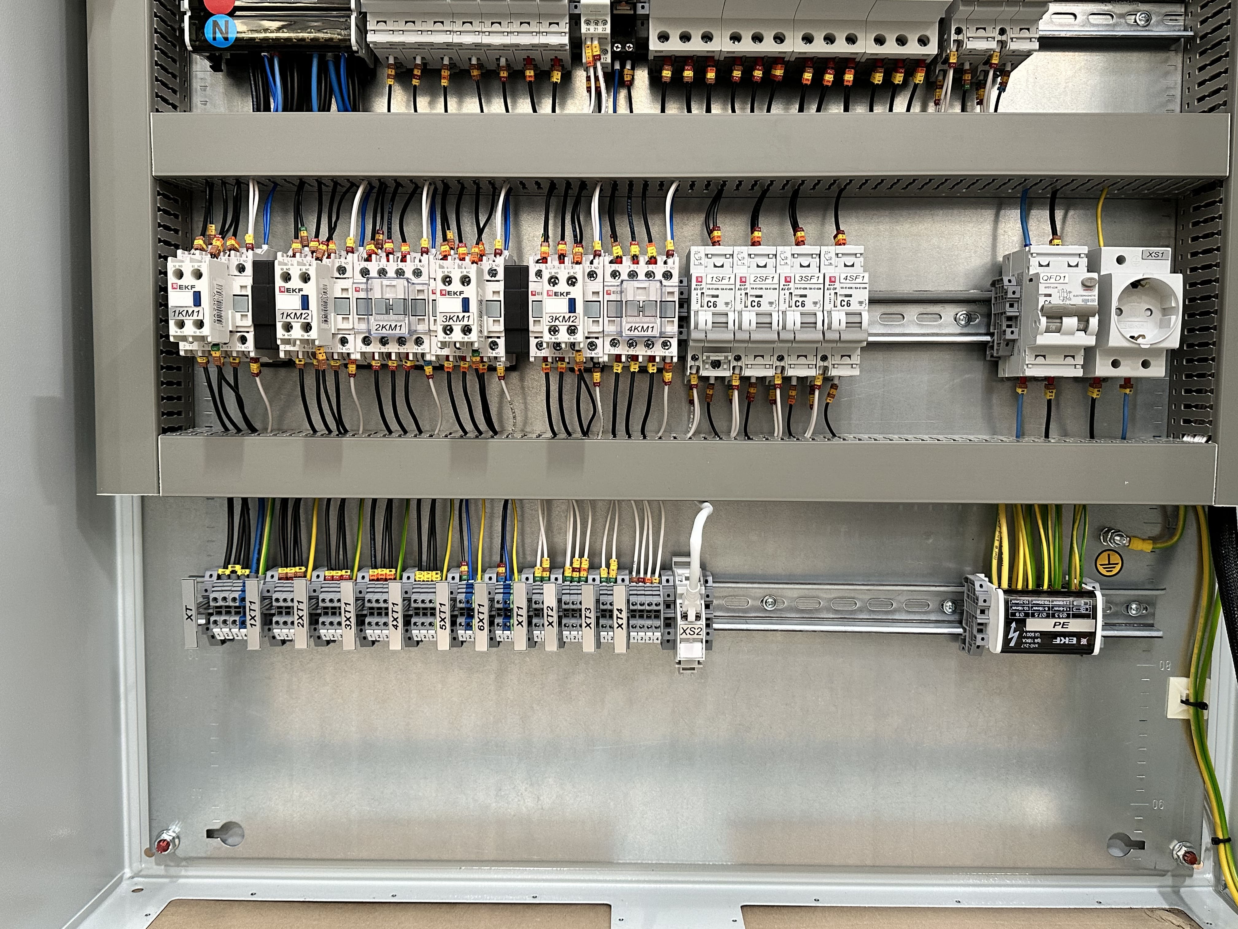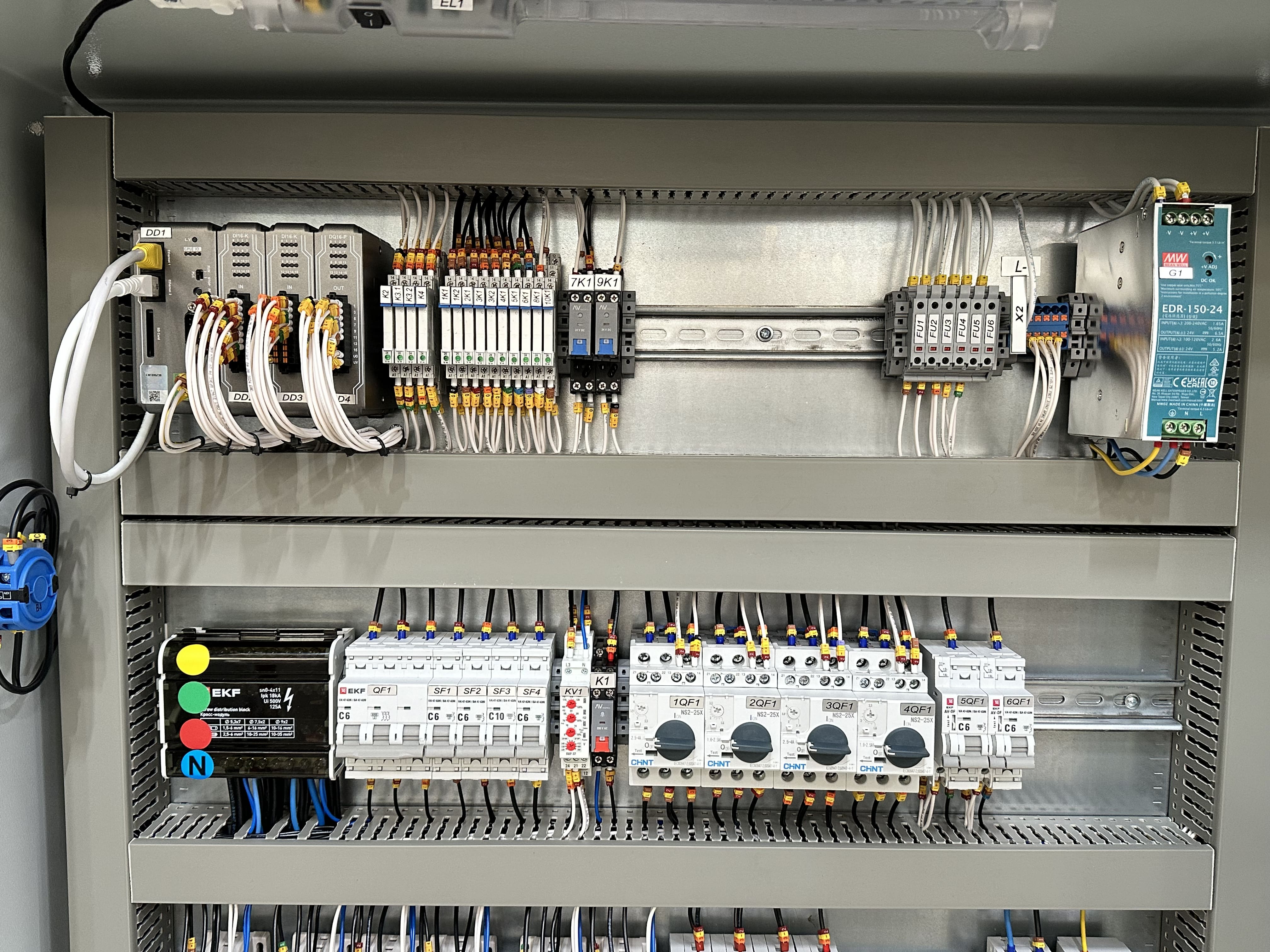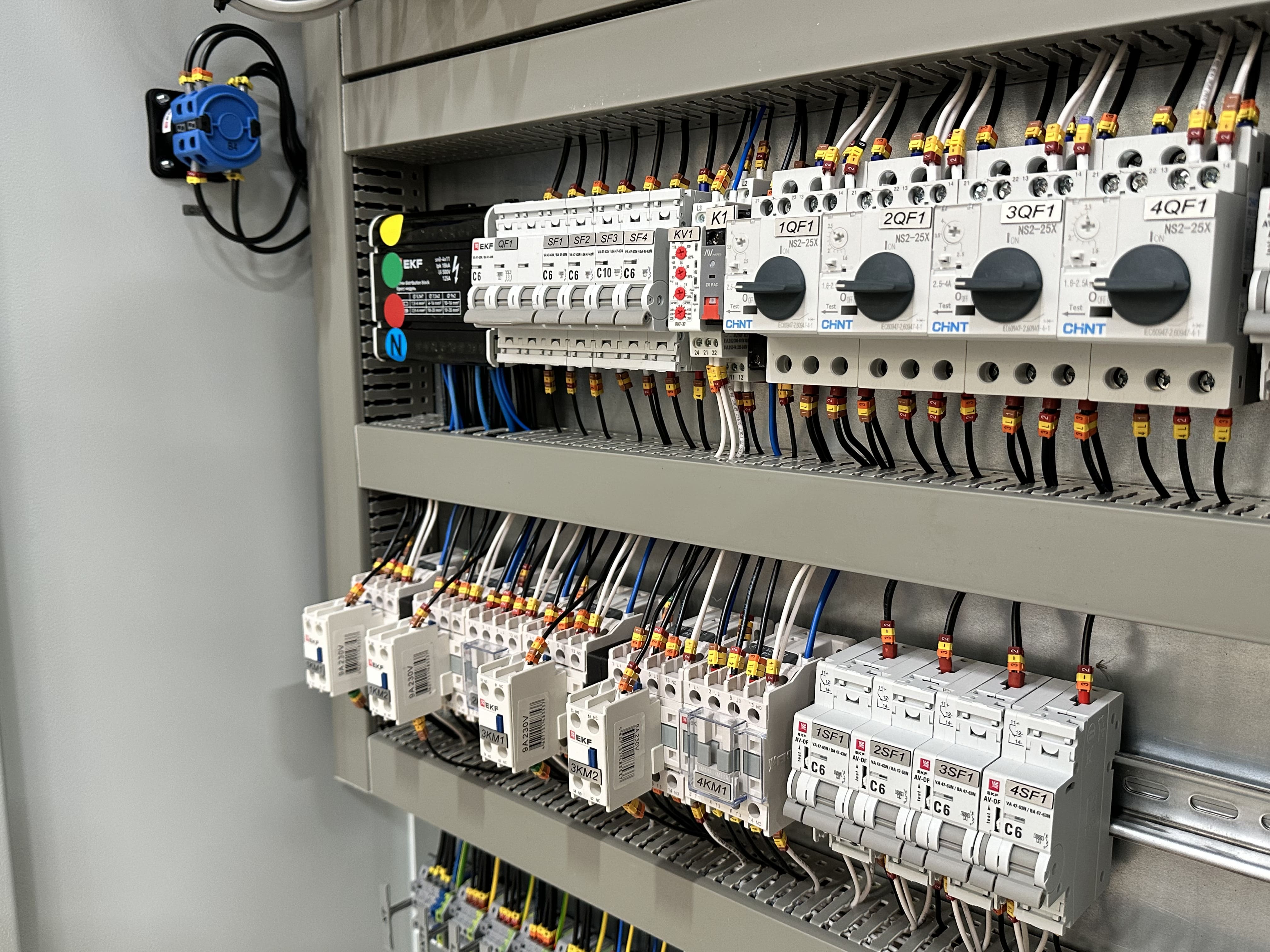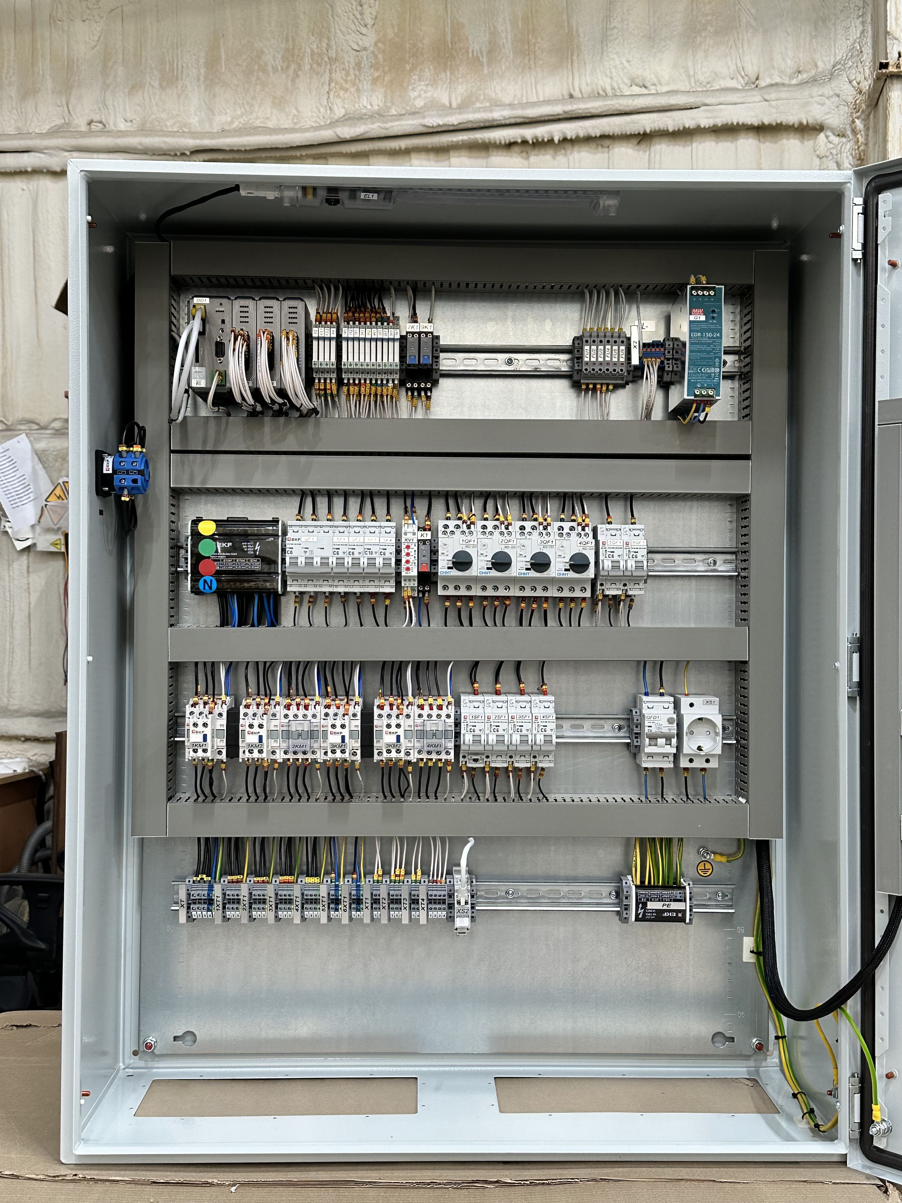 Основная задача данного шкафа – прямое и реверсивное управление шнеками, управление клапанами и задвижками, контроль состояния каждого из их этих агрегатов и передача данной информации на автоматизированное рабочее место оператора и сенсорную панель оператора.